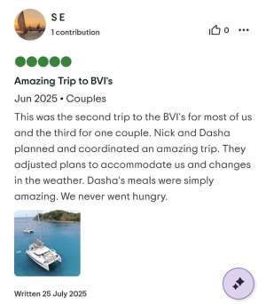 This was the second trip to the BVI's for most of us and the third for one couple. Nick and Dasa planned and coordinated an amazing trip. They adjusted plans to accommodate us and changes in the weather. Dasa's meals were simply amazing. We never went hungry.
