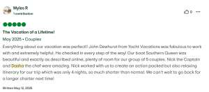 Everything about our vacation was perfect!! John Dewhurst from Yacht Vacations was fabulous to work with and extremely helpful. He checked in every step of the way! Our boat Southern Queen was beautiful and exactly as described online, plenty of room for our group of 5 couples. Nick the Captain and Dasa the chef were amazing. Nick worked with us to create an action packed but also relaxing itinerary for our trip which was only 4 nights, so much shorter than normal. We can't wait to go back for a longer charter next time!