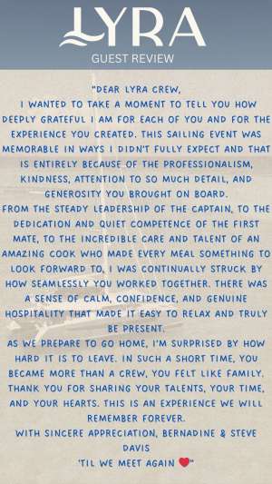 I wanted to take a moment to tell you how deeply grateful I am for each of you and for the experience you created. This sailing event was memorable in ways I didn’t fully expect and that is entirely because of the professionalism, kindness, attention to so much detail, and generosity you brought on board. From the steady leadership of the captain, to the dedication and quiet competence of the first mate, to the incredible care and talent of an amazing cook who made every meal something to look forward to, I was continually struck by how seamlessly you worked together. There was a sense of calm, confidence, and genuine hospitality that made it easy to relax and truly be present.
