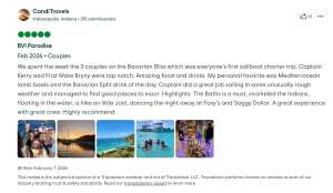 We spent 7 days on Bavarian Bliss with Captain Kerry and Chef/First Mate Bryny and had a good time. I give it four stars because we were only able to sail a couple of days (due to winds and seas), and spent most of the time motoring. In addition, we lost a day due to having to return to port to fix the air conditioning. Seems like the itinerary could have been modified to allow more sailing.