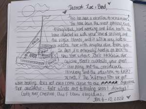 Thank you both for an absolutely unforgettable 8 day adventure! From the moment we stepped on board you made us feel like VIP passengers on our own floating paradise. Captain Brad you did a great job taking care of us through the rough weather and helping us ‘old folks’ in and out of the dinghy. And answering all the questions. The cocktails were wonderful. Hoping I can go home and make some as good as yours. Chef Zoe, every meal was incredible! Beyond our expectations. You both made everything fun, easy and memorable. Thank you again for the laughter, the hospitality and wonderful memories.