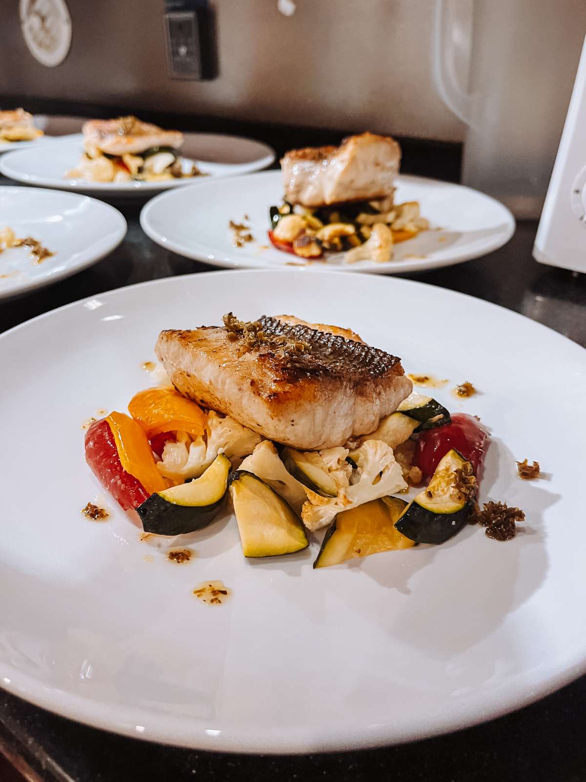 Grilled whole fish with garlic and thyme served with herbs roasted baby potatoes, and stir fried